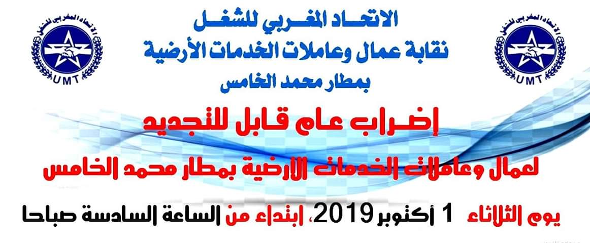 إضــراب عـام قـابل للتجديد لعمال وعاملات الخدمات الأرضية بمطار محمد الخامس يوم الثلاثاء 1 أكتوبر 2019، ابتداء من الساعة السادسة صباحا