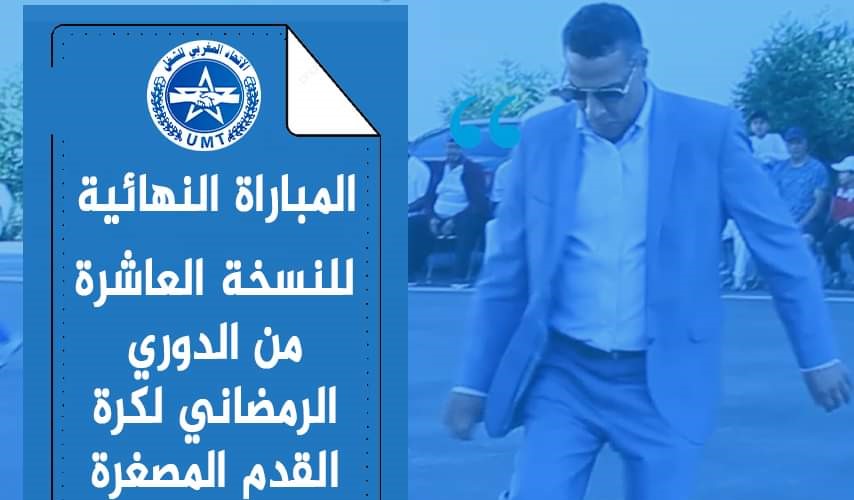 المباراة النهائية للدوري الرمضاني لكرة القدم المصغرة النسخة العاشرة 1445 تحتضن أرضية ملعب المقر المركزي للاتحاد المغربي للشغل المباراة النهائية للنسخة العاشرة من الدوري الرمضاني لكرة القدم المصغرة لسنة 2024 بين فريق الجامعة الوطنية للتكوين… المقر المركزي للاتحاد المغربي للشغل يحتضن المباراة النهائية للنسخة العاشرة للدوري الرمضاني لكرة القدم المصغرة