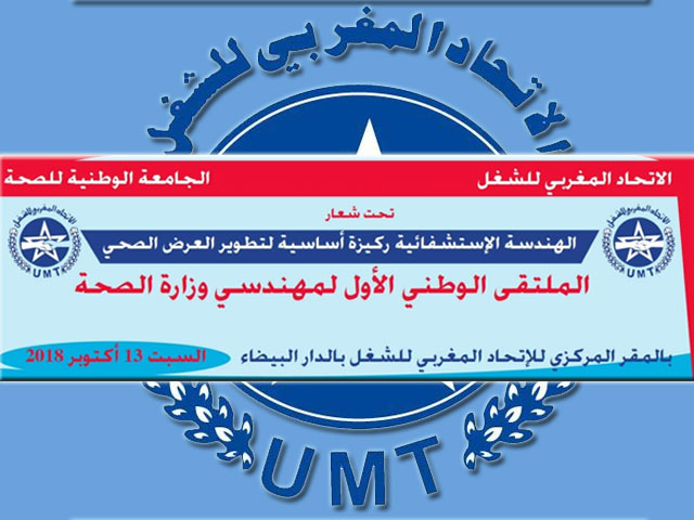 تحت شعار “الهندسة الإستشفائية ركيزة أساسية لتطوير العرض الصحي” تنظم الجامعة الوطنية للصحة (إ م ش) الملتقى الوطني الأول لمهندسي وزارة الصحة؛ وذلك يوم السبت 13 أكتوبر 2018 بالمقر المركزي للإتحاد المغربي للشغل بالدار البيضاء،… الملتقى الوطني الأول لمهندسي وزارة الصحة السبت 13 أكتوبر 2018 بالدار البيضاء