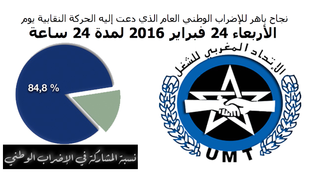 بكل وعي ومسؤولية نفذت الطبقة العاملة المغربية الإضراب الوطني العام، الذي دعت إليه المركزيات النقابية الأكثر تمثيلية: الاتحاد المغربي للشغل، الكونفدرالية الديمقراطية، الاتحاد العام للشغالين بالمغرب، الفدرالية الديمقراطية للشغل والنقابة الوطنية للتعليم العالي: يوم الأربعاء… نجاح باهر للإضراب الوطني العام الذي دعت إليه الحركة النقابية يوم الأربعاء 24 فبراير 2016 لمدة 24 ساعة