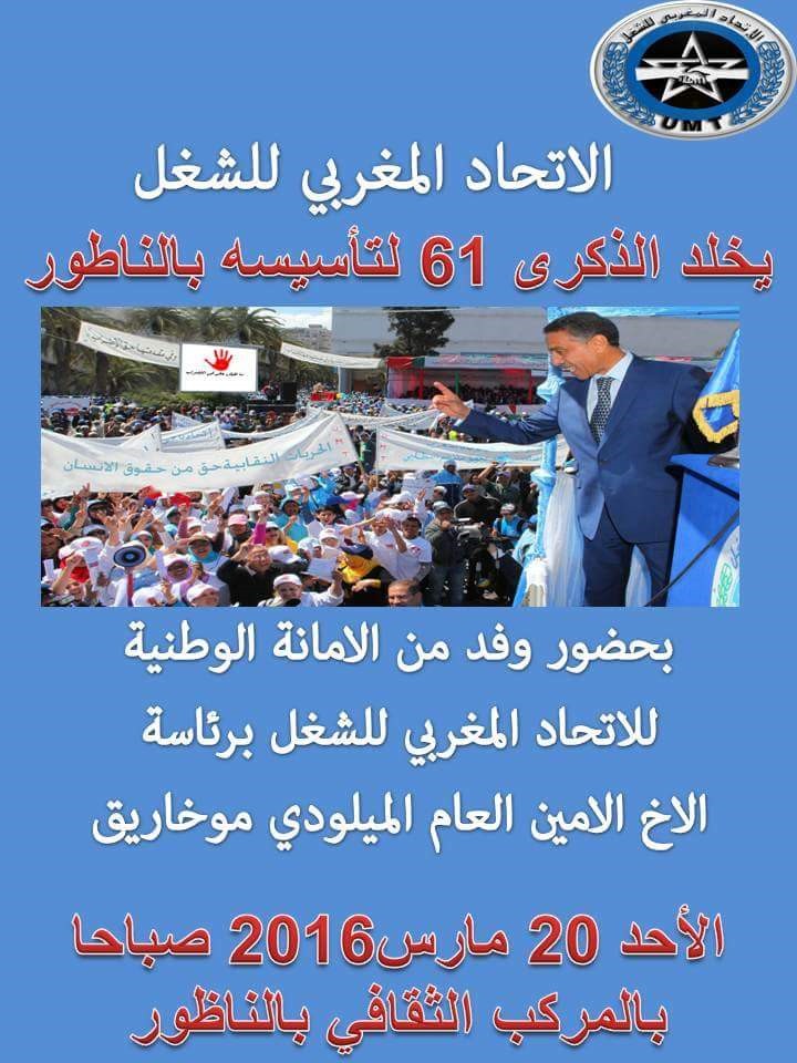 أخواتي، إخواني، تنديدا بموقف بان كيمون، الأمين العام للأمم المتحدة، حول قضية وحدتنا الترابية، وتأكيدا لدور الحركة النقابية في معركة التحرير الوطنية، ودفاعا عن صحرائنا المغربية : تنظم يوم الأحد 13 مارس 2016 بالرباط على… نــــــــــــــــــداء إلى الطـبـقـة العـامـلـة الـمـغـربـيـة من أجل المشاركة في مسيرة الـوحدة الـوطـنية بالرباط يوم الأحد 13 مارس 2016