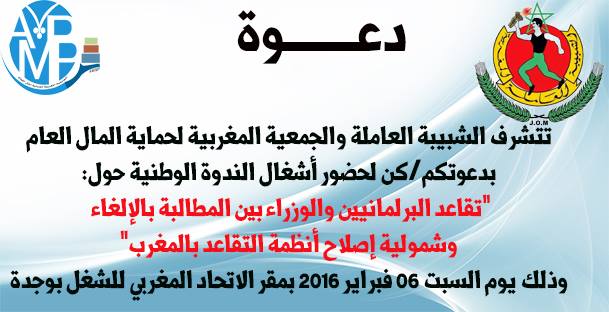 أخــــواتي إخــــواني أعلنت الحركة النقابية المغربية ممثلة في المركزيات النقابية الأربع: الاتحاد المغربي للشغل، الكونفدرالية الديمقراطية للشغل، الاتحاد العام للشغالين بالمغرب والفيدرالية الديمقراطية للشغل عن خوضها ل : إضراب وطني عام يوم الأربعاء 24 فبراير… نداء إلى كل المهنيين، التجار بكل أصنافهم، الحرفيين، وأصحاب المهن الحرة… من أجل الانخراط في الإضراب الوطني العام يوم الأربعاء 24 فبراير 2016